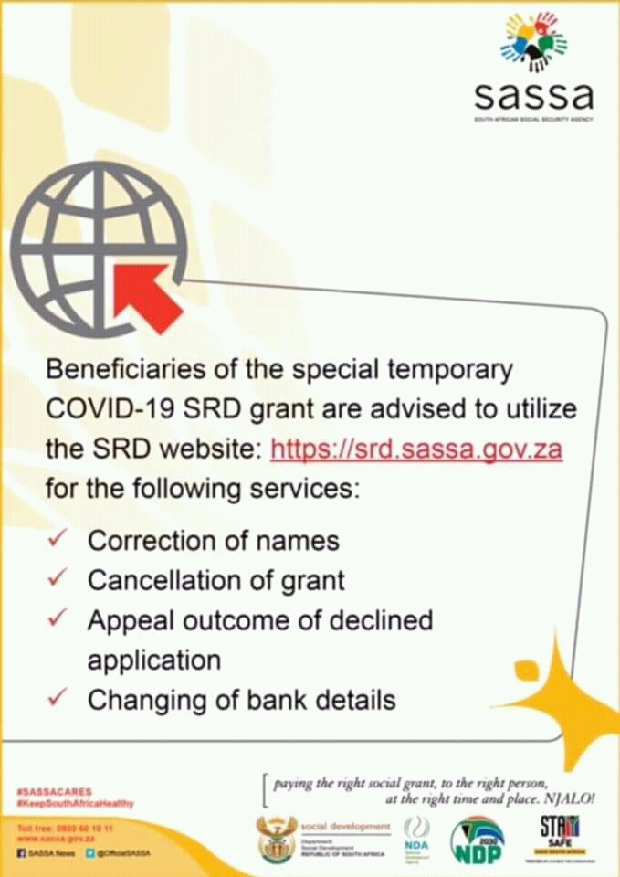 I undertake to immediately notify sassa of any change in my / the applicant's financial circumstances, contact details or change in circumstances in relation to clause 1.1 which would disqualify me / the applicant from Feb 13, 2021 · the r350 social relief of distress grant (srd) administered by the south african social security agency (sassa) has been extended for a further three months to provide financial relief to those unemployed during lockdown. Recipients already registered on the system do not need to reapply. May 29, 2020 · link: Applicants must meet the following requirements: